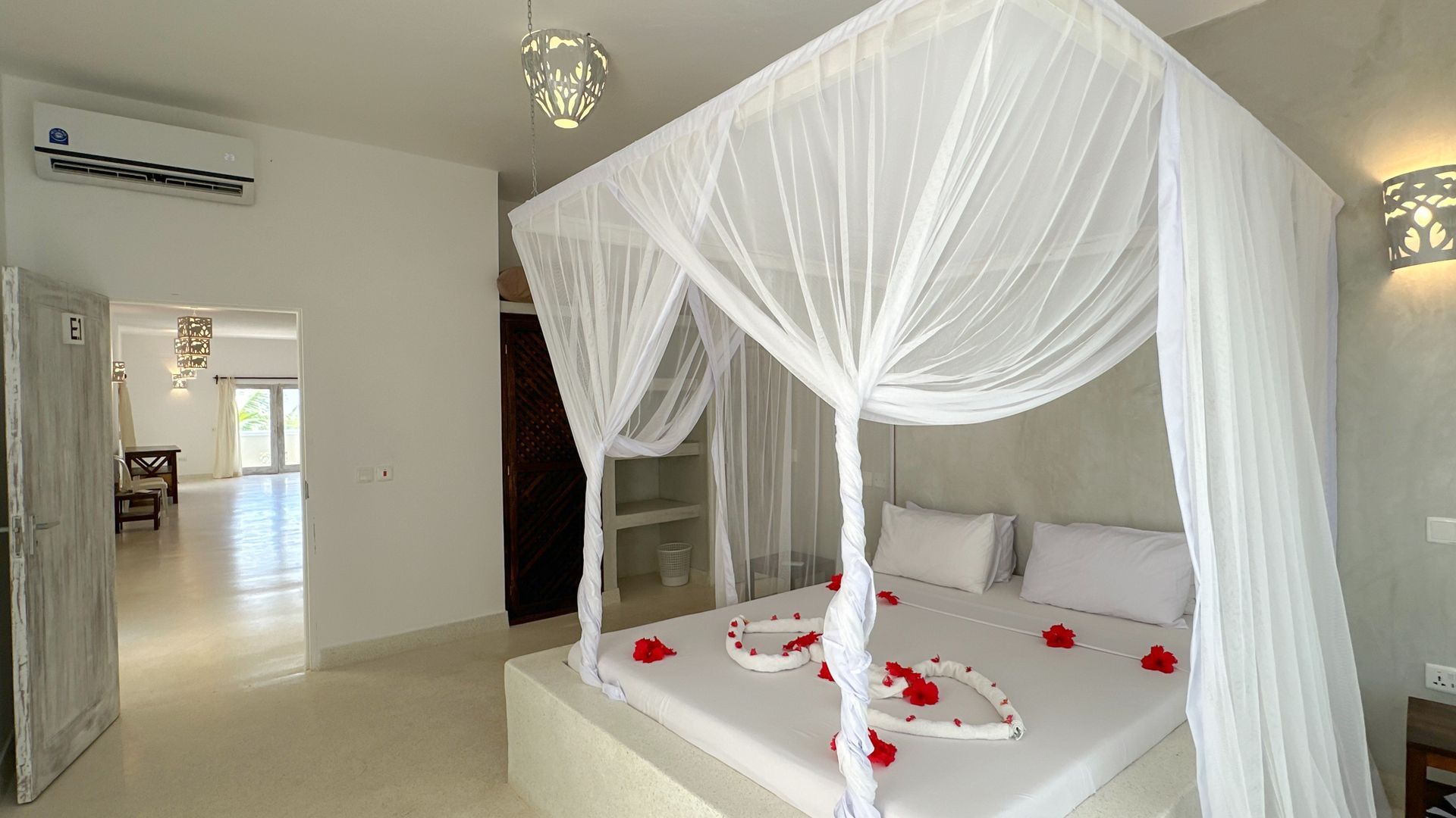 A stylish 2-bedroom first-floor apartment with spacious balconies and a dining area, offering comfort and private beach access.